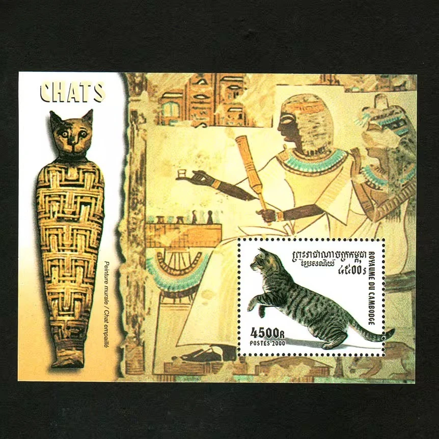 1 Blatt neuer Kambodscha-Poststempel 2000, altägyptisches Wandbild, Katzenkopf, Artefakt, Souvenirblatt, Briefmarken, postfrisch