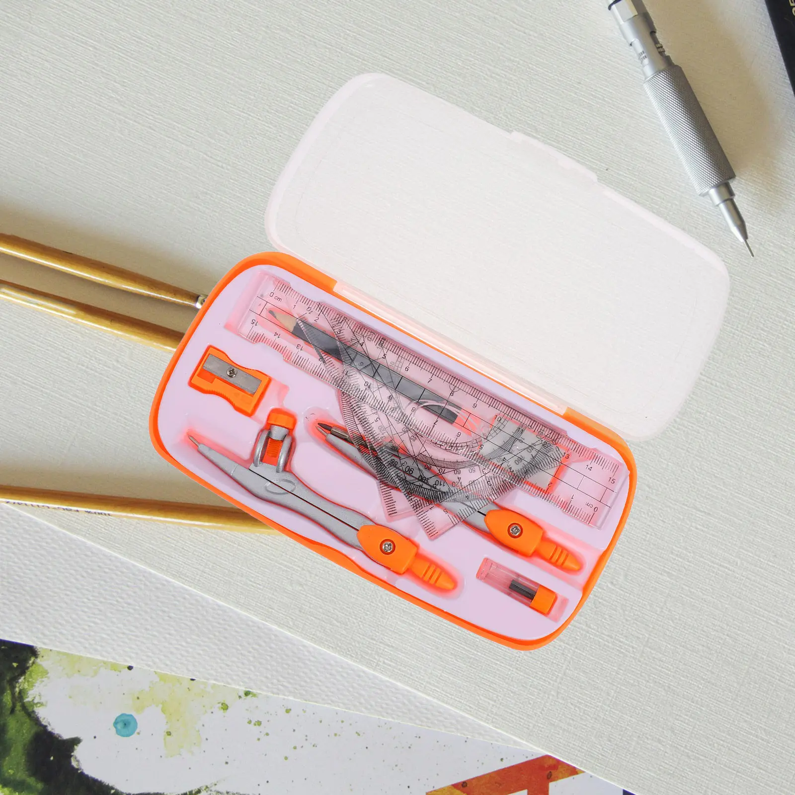 8-in-1-Kompass-Lineal-Set mit Eisenbox, mathematische Geometrie, Zeichenwerkzeuge, Winkelmesser, Schreibwaren für Studenten