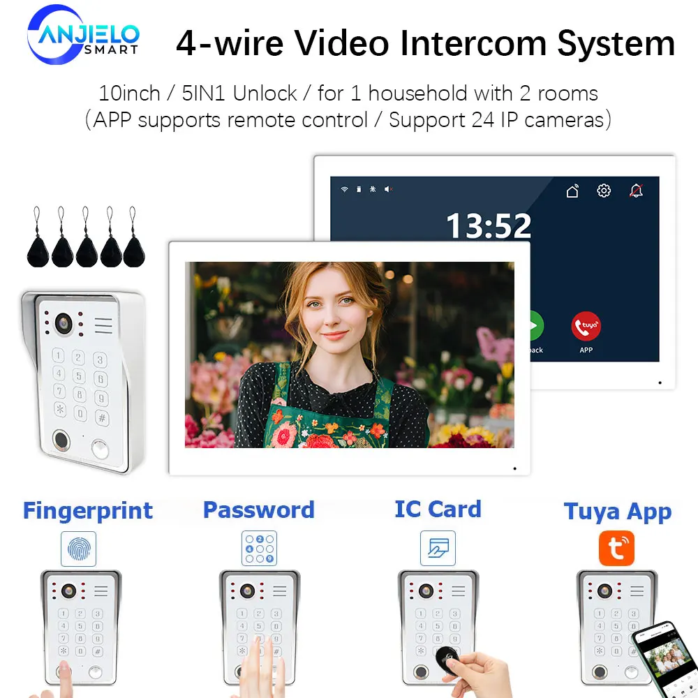 ANJIELO 2-Draht-Türklingel-Video aus Metall mit TUYA-IC-Karte, PIN-Entsperrung, 24 IP-Kamera, unterstützt intelligentes Video-Gegensprechanlage für Zuhause, 1080P