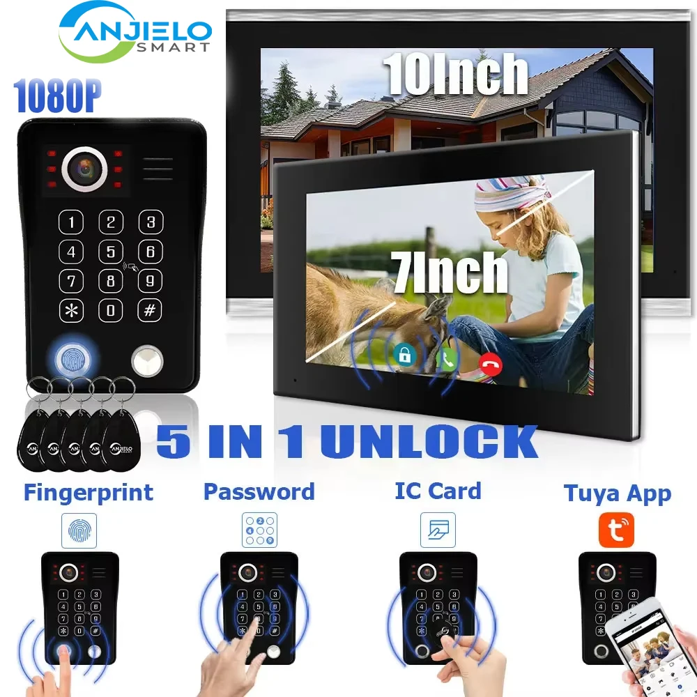 Anjielo Fingerabdruck 5-in-1 Türklingel-Video-Gegensprechanlage für Zuhause, Video-Türsprechanlage 1080P Tuya Sicherheit 7-Zoll-Monitor 1V3