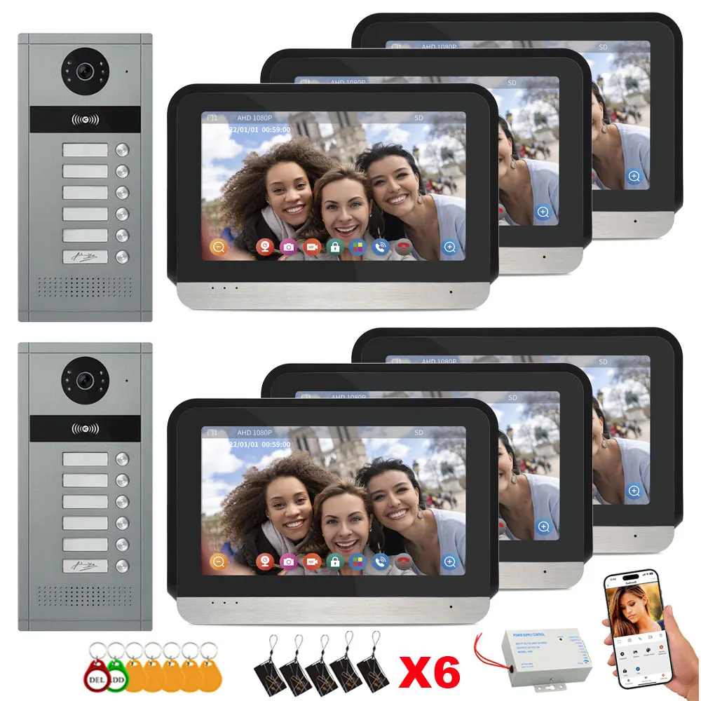 7-Zoll-Farb-Kamera-Video-Türsprechanlage-Set Türklingel-Gegensprechanlage RFID-Zugangskontrolle zum Entsperren für 2/3/4/6 Einheiten Mehrfamilienhäuser