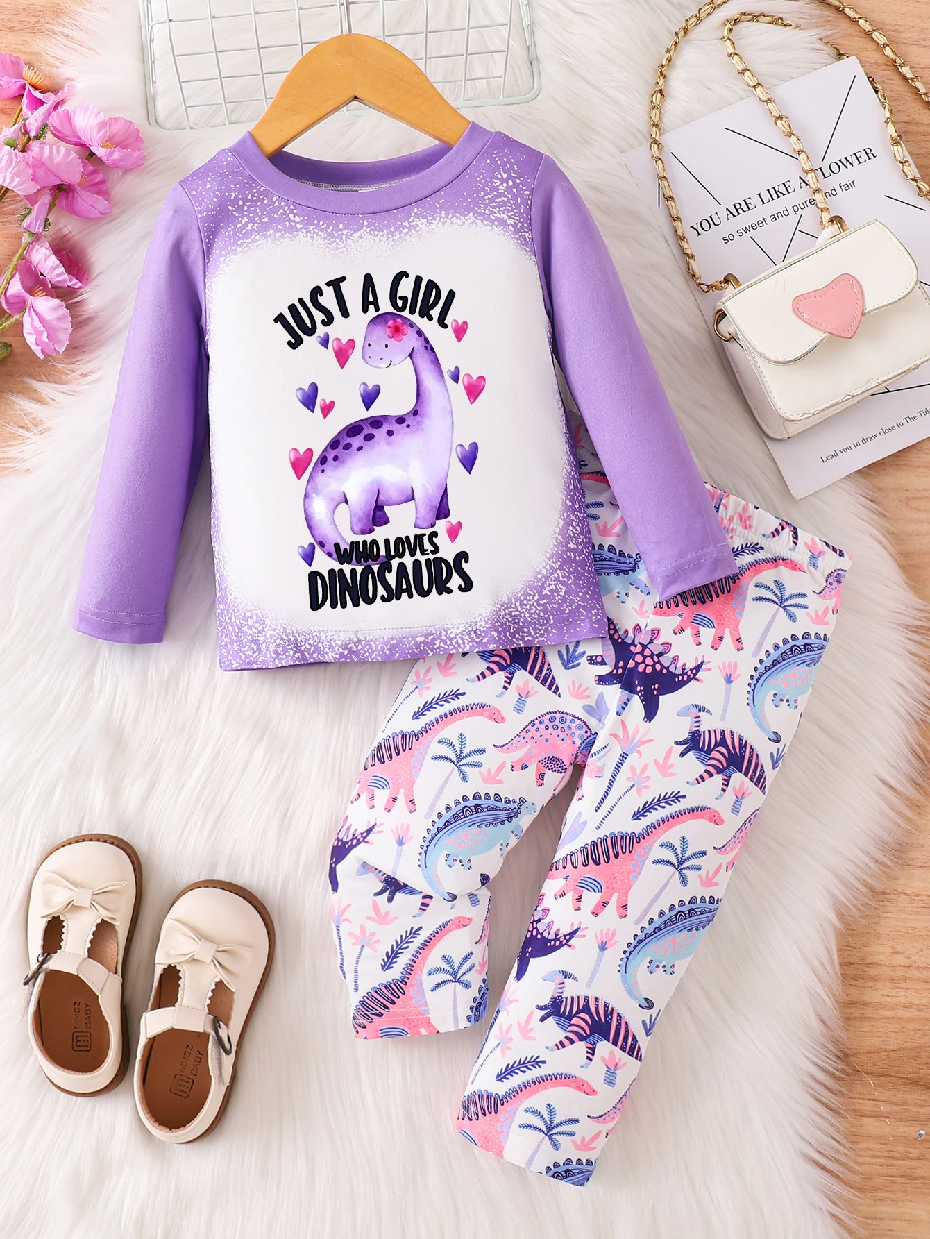 Lila bedrucktes Set „Just A Girl Who Loves Dinosaurs“ – sanftes, trendiges Zweiteiler-Set für Kinder