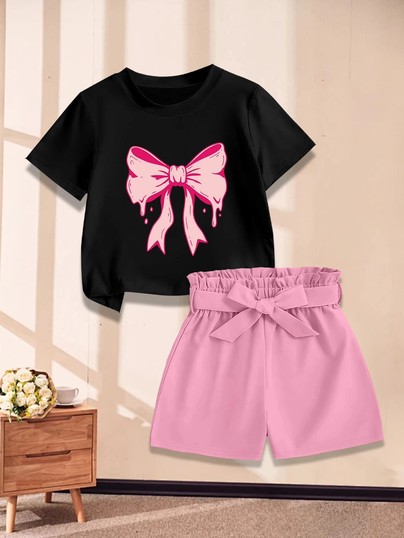 2-teiliges Set: Süßes Sommer-Shorts-Set für Mädchen mit Cartoon-Schleifenmuster