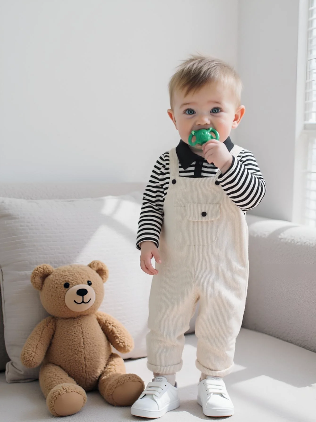 2-teiliges Set aus gestreiftem Langarm-Poloshirt und Cord-Latzhose mit verstellbarer Länge für Jungen, Frühling und Herbst
