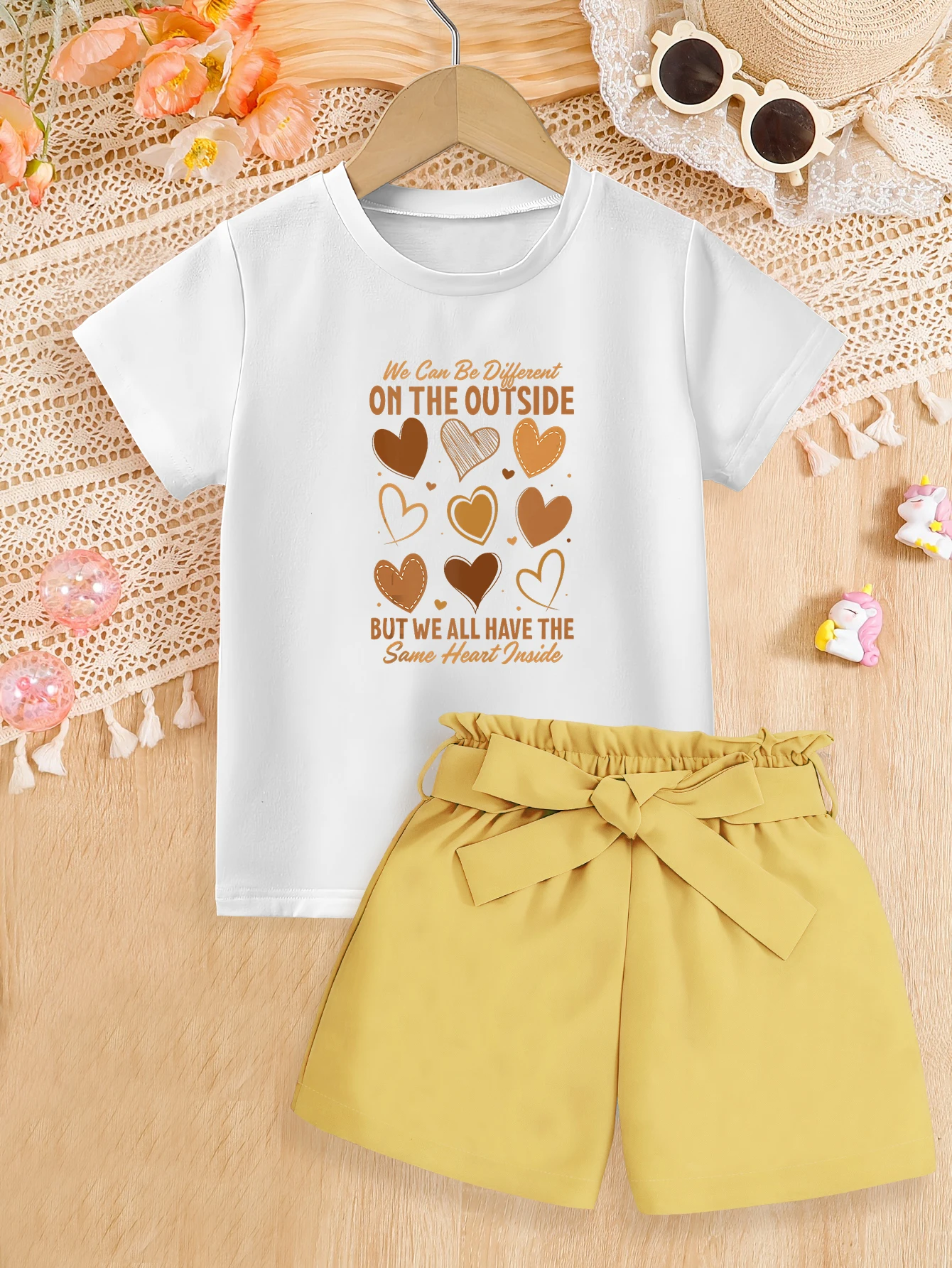 2-teiliges Set: Sommer-Set für Mädchen zum Valentinstag, süßes T-Shirt mit Cartoon-Herz-Aufdruck, gewebte Shorts mit Schleife