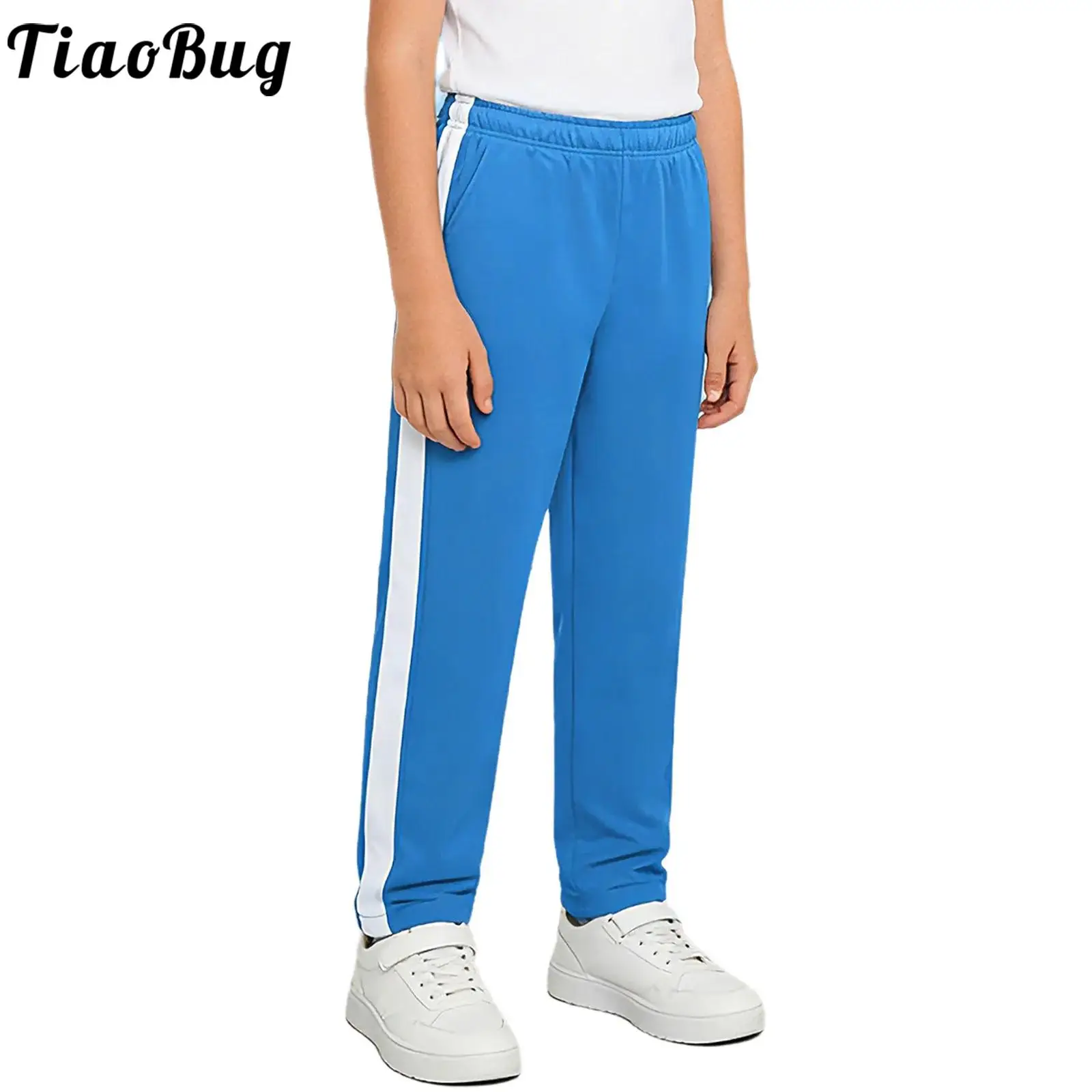 Jungen- und Mädchen-Jogginghose mit kontrastierenden Streifen, Kordelzug, elastischem Bund, gerade geschnittene Hose, Schulsport-Hose mit Taschen