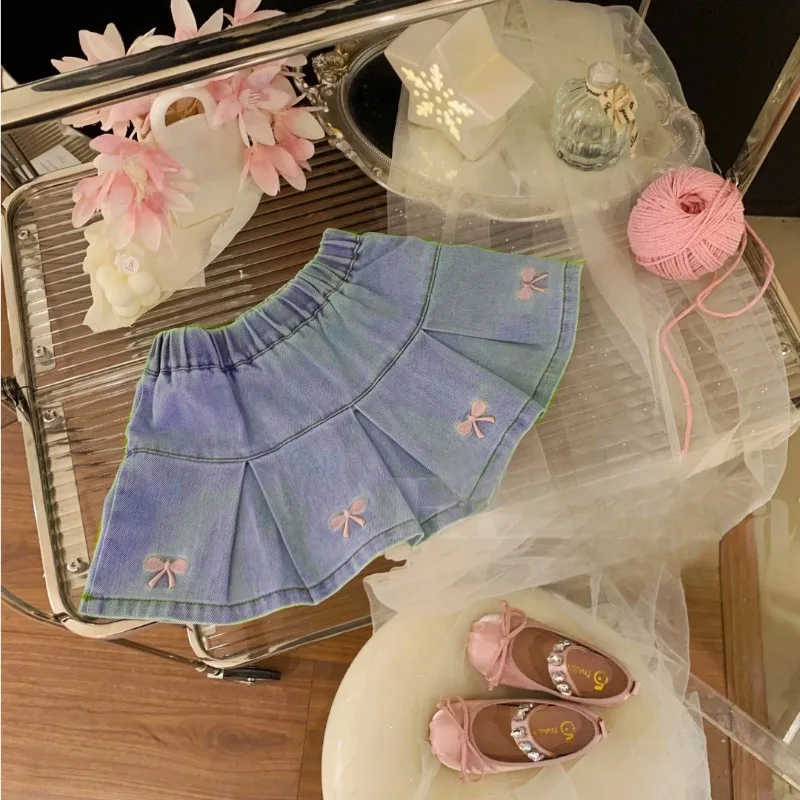 UNITIM Faltenröcke für Kinder, Mädchen, rosa Schleife, Stickerei, Jeansröcke für Kinder, lockere, süße Sommerröcke für Babys im Alter von 2–8 Jahren