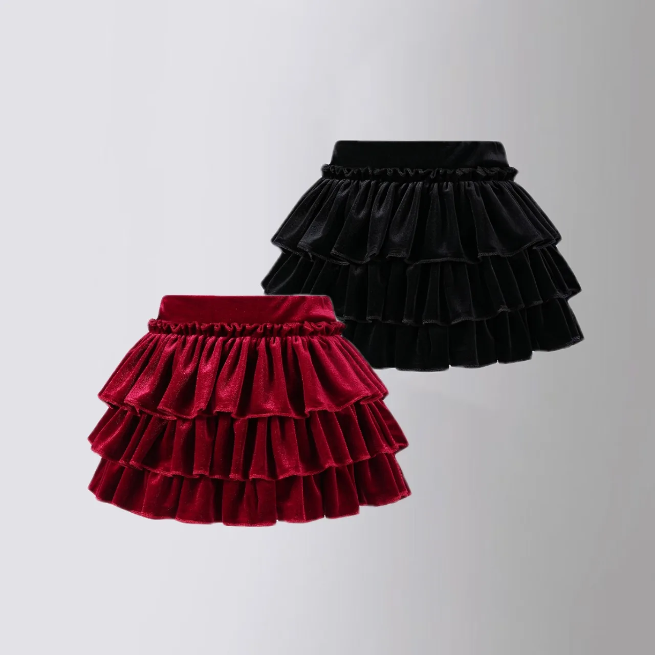 2026 Mädchen-Rock aus schwarzem Samt mit abgestuftem Kuchen, hohe Taille, A-Linie, kurz, Frühling, ausgestellte Partykleidung, vielseitige mehrlagige Röcke für Schulkinder
