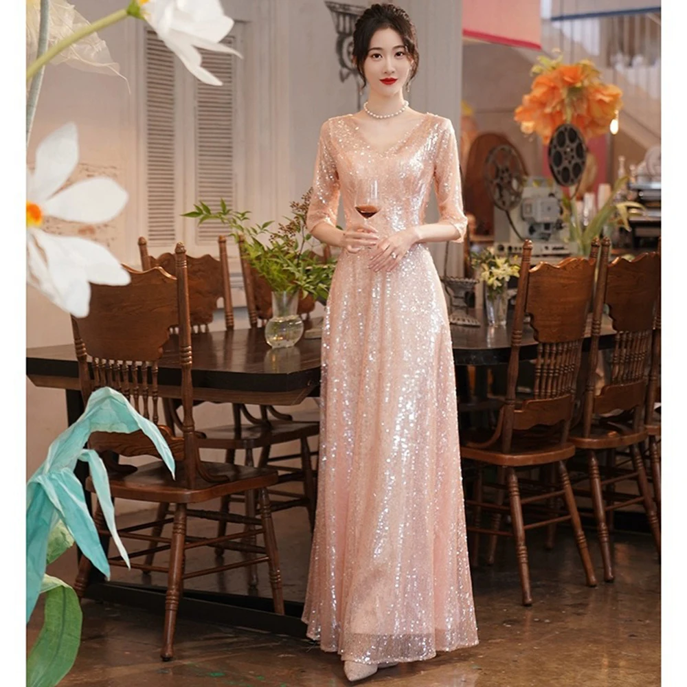BABYONLINE A-Linien-Kleid mit langen Pailletten und tiefem Ausschnitt, Brautjungfernkleid, Seitentaschen vorne, bodenlanges Kleid für die Hochzeitsfeier