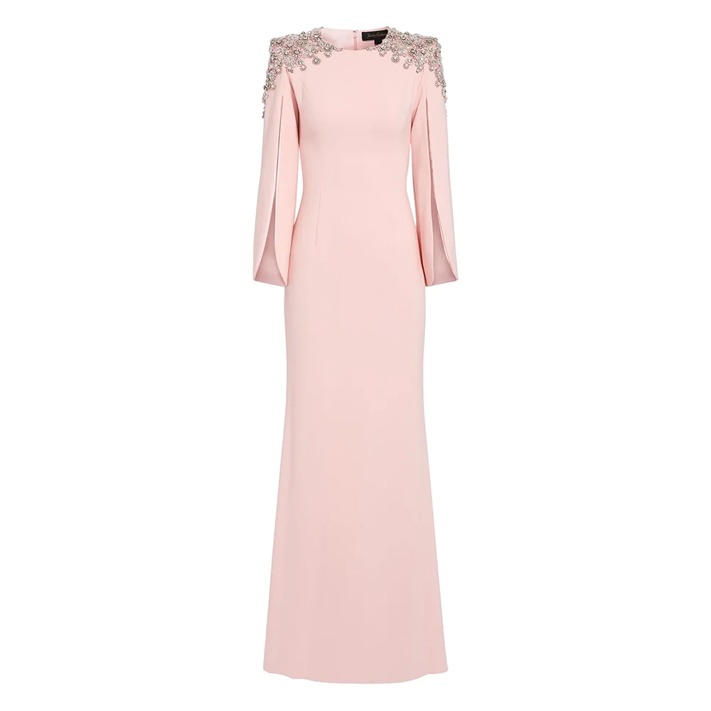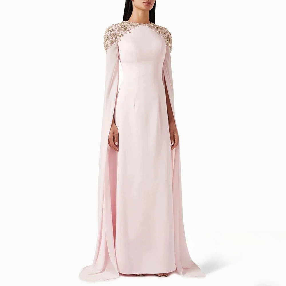 Rosa Abendkleid nach Maß mit O-Ausschnitt, langen Ärmeln, Perlenstickerei, Kristallen, arabisches Hochzeitskleid, bodenlanges Ballkleid 2026