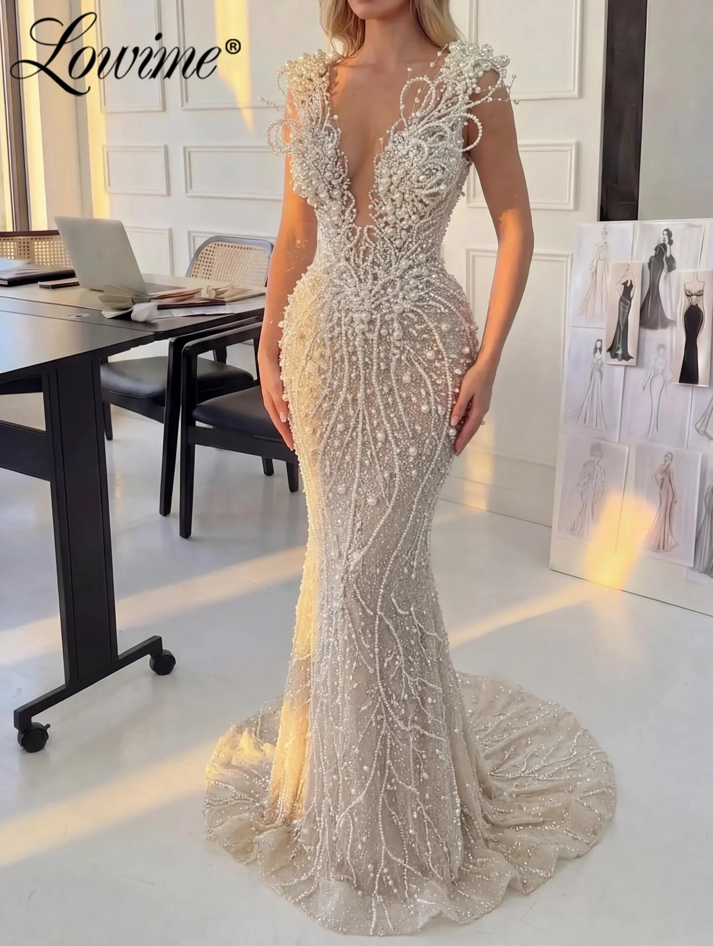 Neues Modisches Perlen-Abendkleid mit Tiefem V-Ausschnitt Meerjungfrau-Ballkleid Maßgeschneidert in Hellchampagner für Hochzeiten und Partys 2026