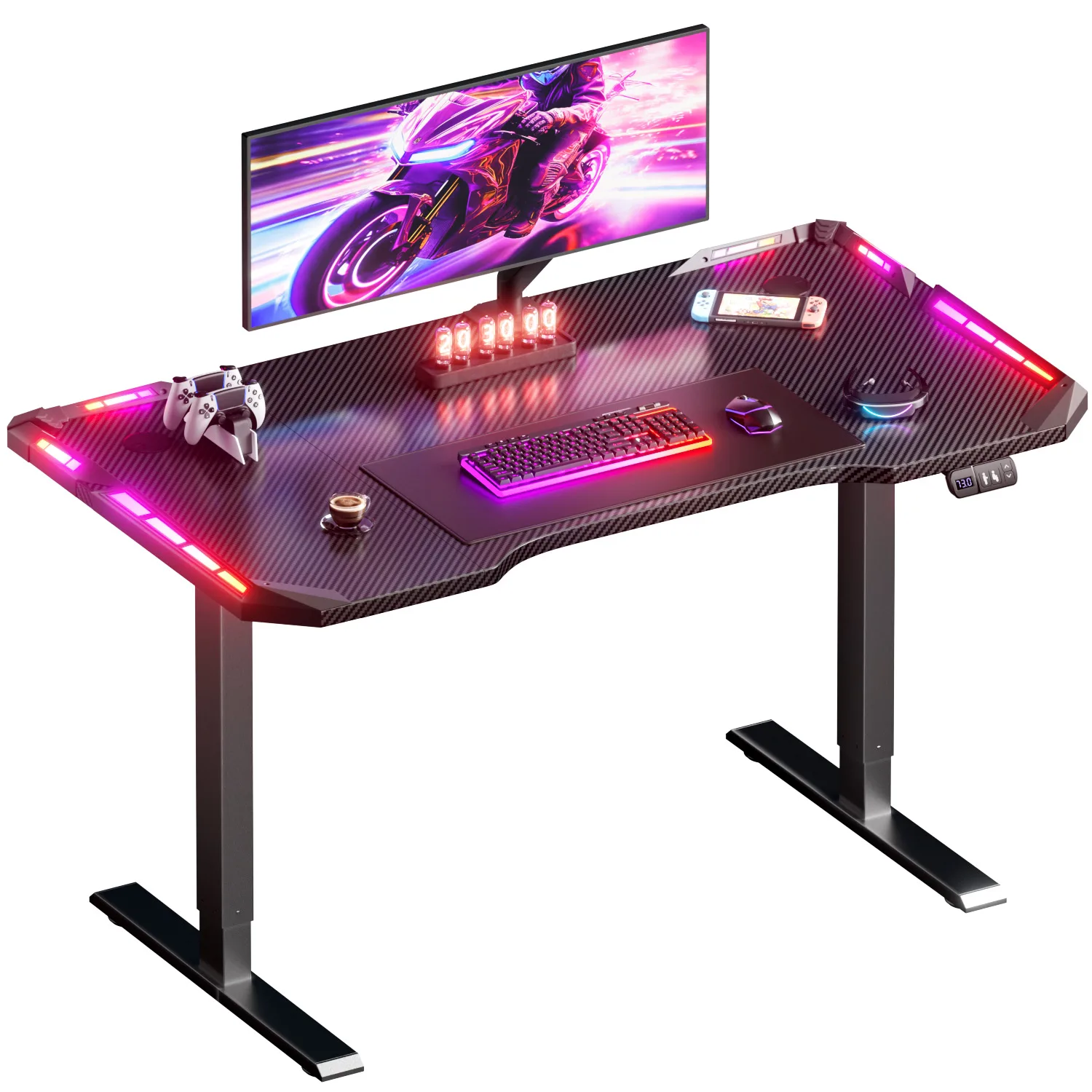 120/140/160cm Elektrisch Höhenverstellbarer Tisch, Ergonomischer Gaming-Schreibtisch mit LED-Beleuchtung, Carbonfaser-Tischplatte für Home Office