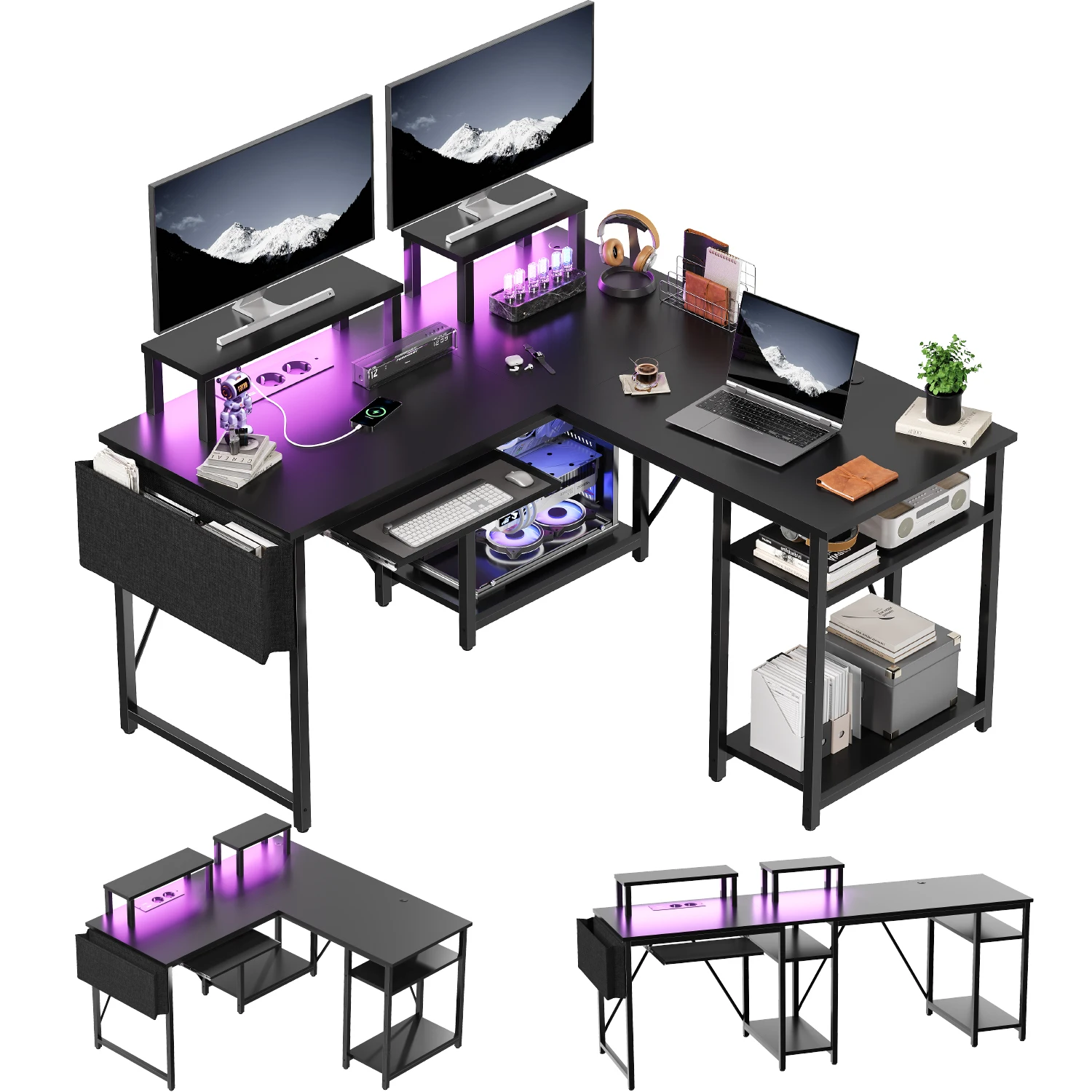Devoko Gaming Schreibtisch mit Steckdosen und LED Leuchten, Computer Eckschreibtisch mit Regalen für kleine Räume