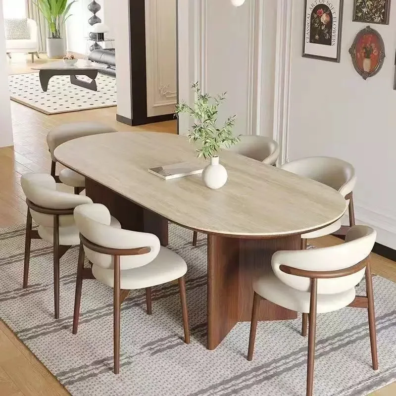 Mid-Century Luxus Modern Ovaler Marmor Massivholz Esstisch Stuhl-Set 4-6 Sitzer Küche Komplette Möbel Travertin-Designs
