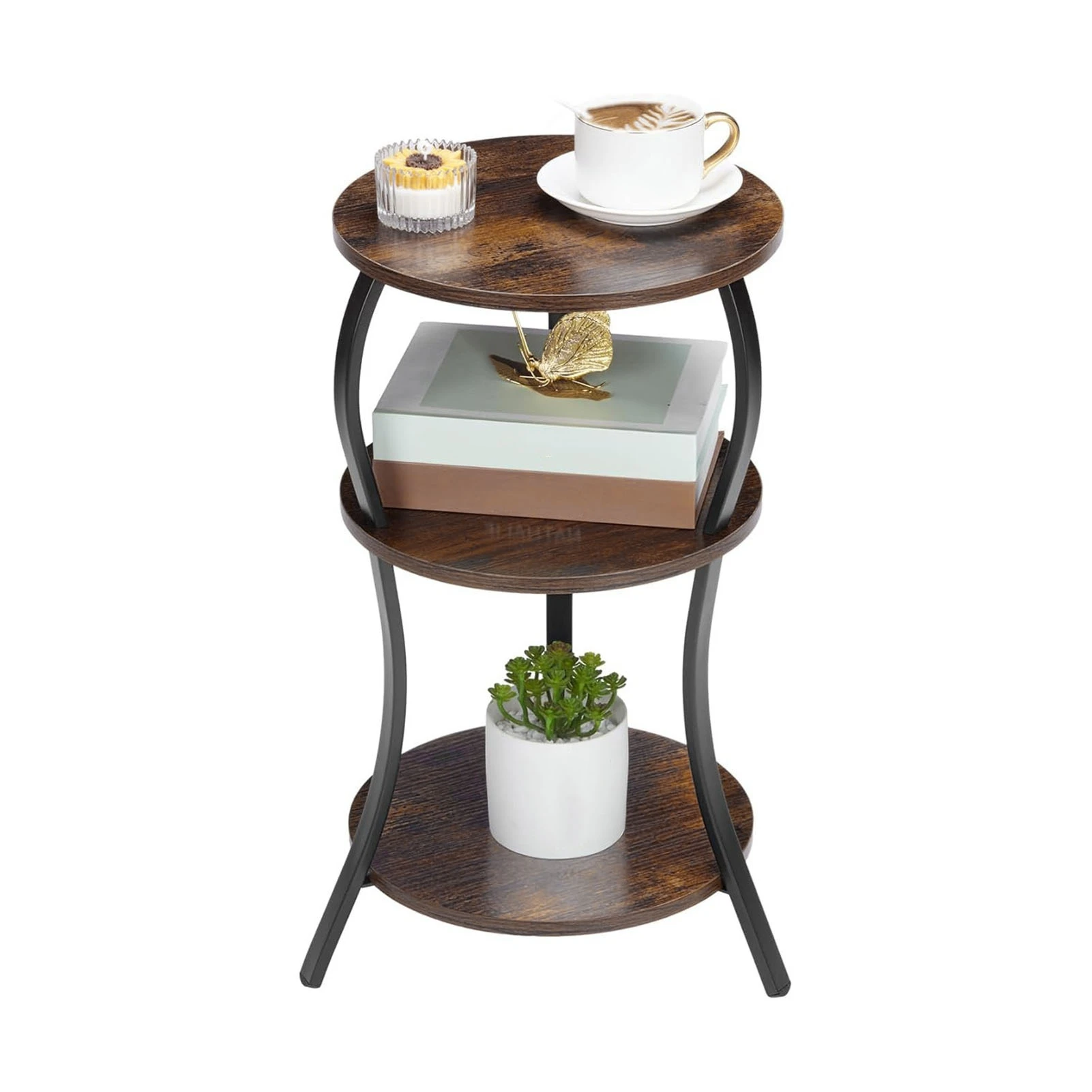NEUER Beistelltisch Runder Beistelltisch 3-stufiger MDF Metallrahmen Rustikaler Akzenttisch Nachttisch für Wohnzimmer Schlafzimmer Couch