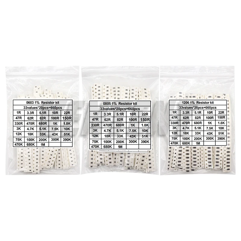 660 Stück 0201 0603 0402 0805 1206 1% SMD Chip-Widerstand Sortiment 1R - 1M Ohm 33 Werte X 20 Stück Widerstandsmuster-Set
