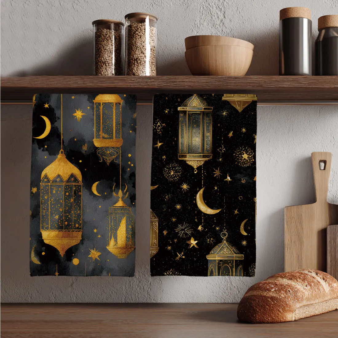 2PC Küchenhandtuch Ramadan Schwarz Gold Laterne Mond bedrucktes Mikrofaser-Küchentuch, saugfähiges Küchentuch/Handtuch, Dekoration