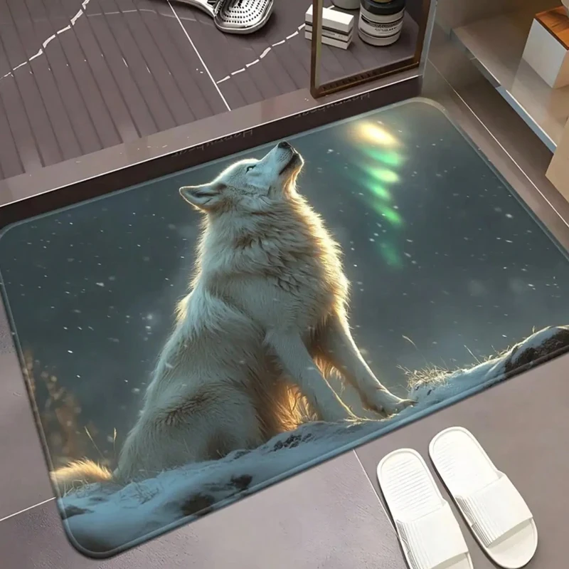 Atemberaubende, rutschfeste, saugfähige, schnell trocknende Fußmatte mit weißem Wolf-Aurora-Muster, Premium-Bodenteppich für den Badezimmeringang, Heimdekoration