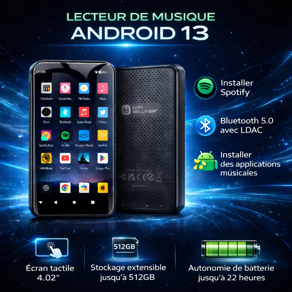Android 13 MP3-Player mit Bluetooth, WLAN, Spotify, Pandora, FM-Radio, 4,02-Zoll-Touchscreen, 80 GB Speicher, Hifi Walker G7 Mini