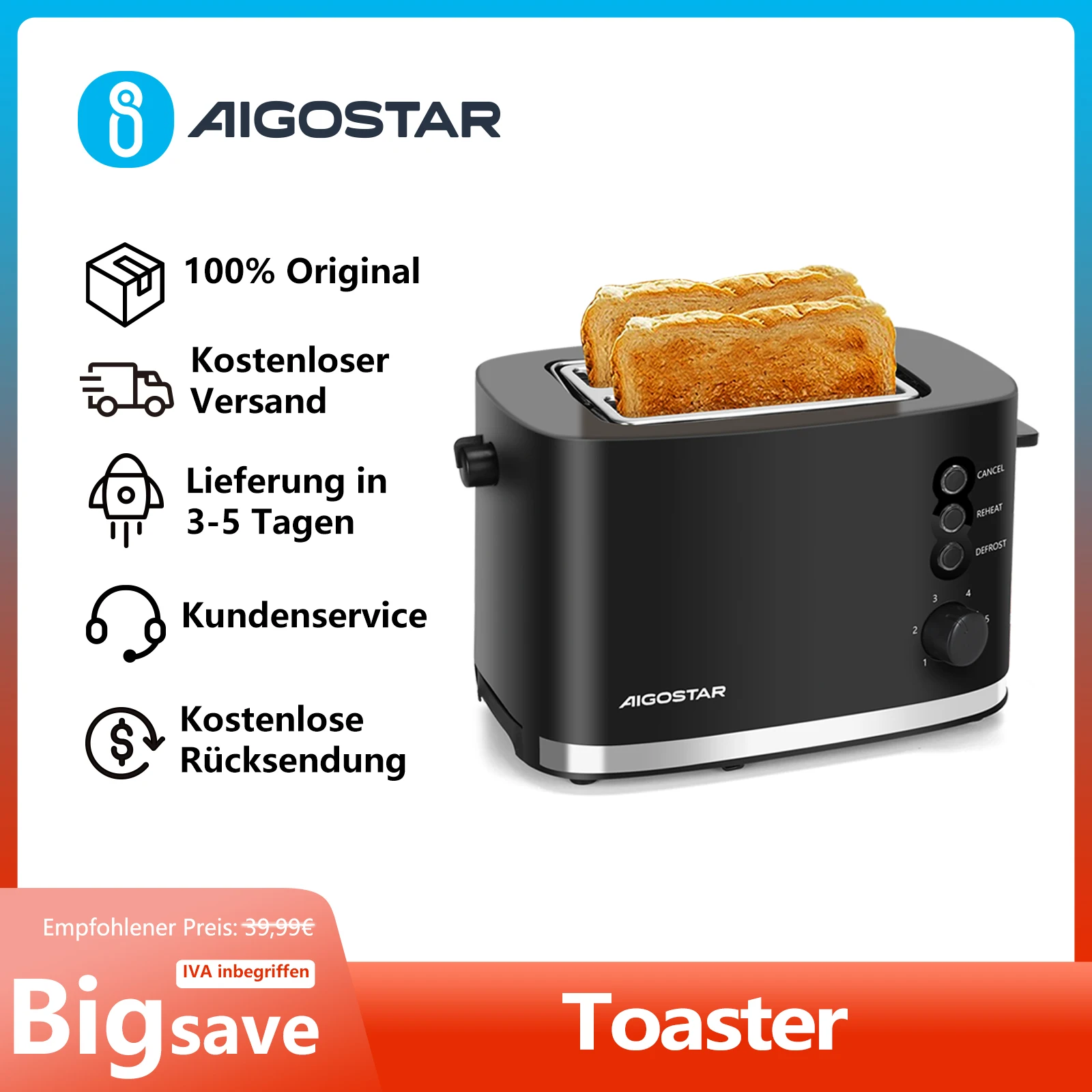 Aigostar Toaster 2 Scheiben mit Brötchenaufsatz, extra breite Toastschlitze & Brotzentrierung, 6 Bräunungsstufen, Abbruch-, Auftau- & Aufwärmfunktionen, Krümelschublade, 800W, Schwarz