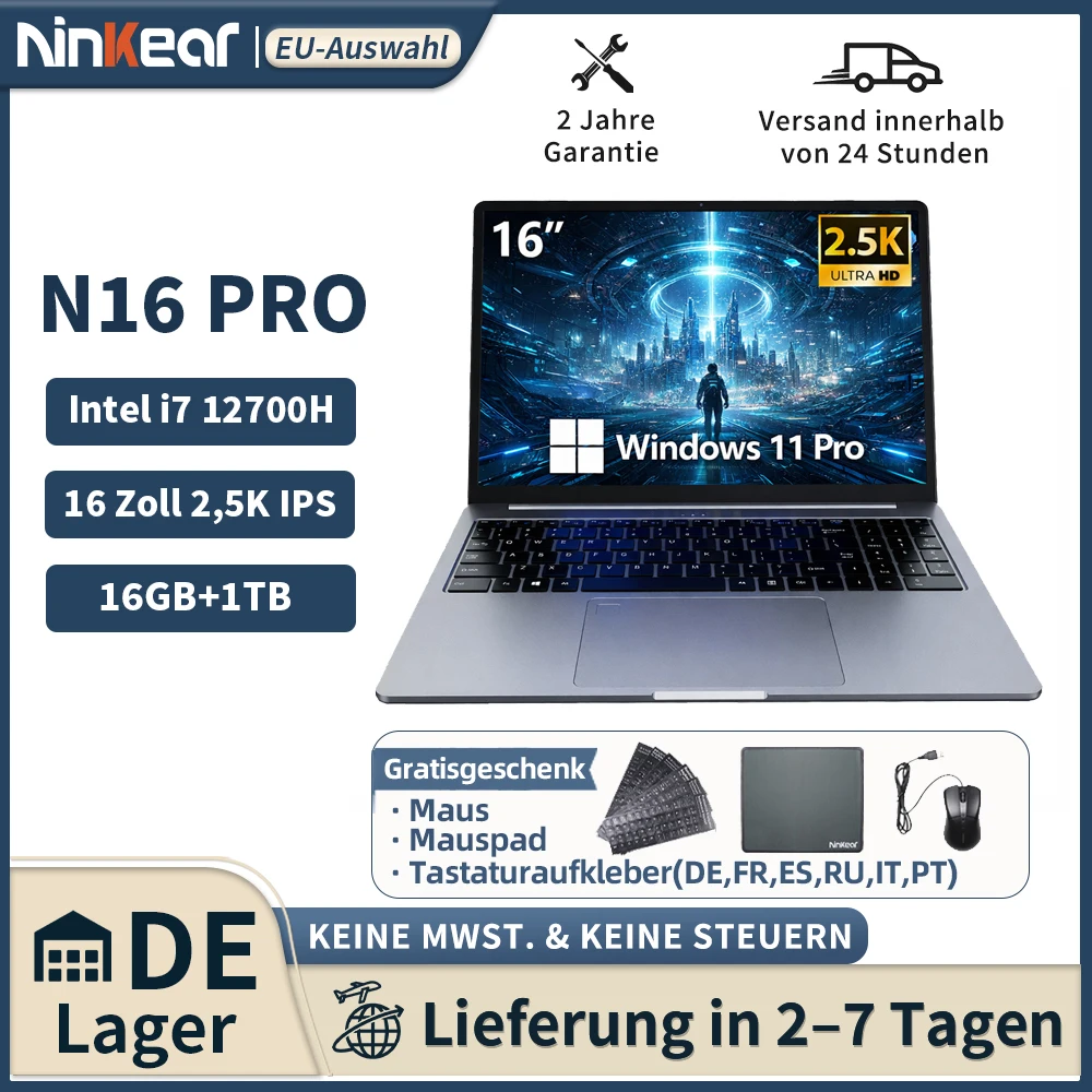 Ninkear N16 Pro Notebook verfügt über ein 16-Zoll-2,5K-Display mit 120 Hz, einen Intel Core i7-12700H Prozessor, WiFi 6 Unterstützung, 16 GB RAM, eine 1 TB SSD, vorinstalliertes Windows 11, Laptops für den Bürogebrauch
