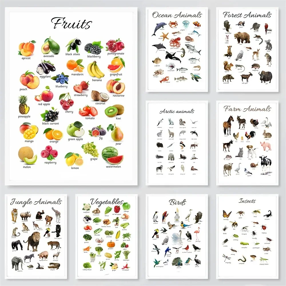Leinwand Malerei Obst Gemüse Tiere Poster Montessori Pädagogische Homeschooling Lernen Poster Raum Dekoration