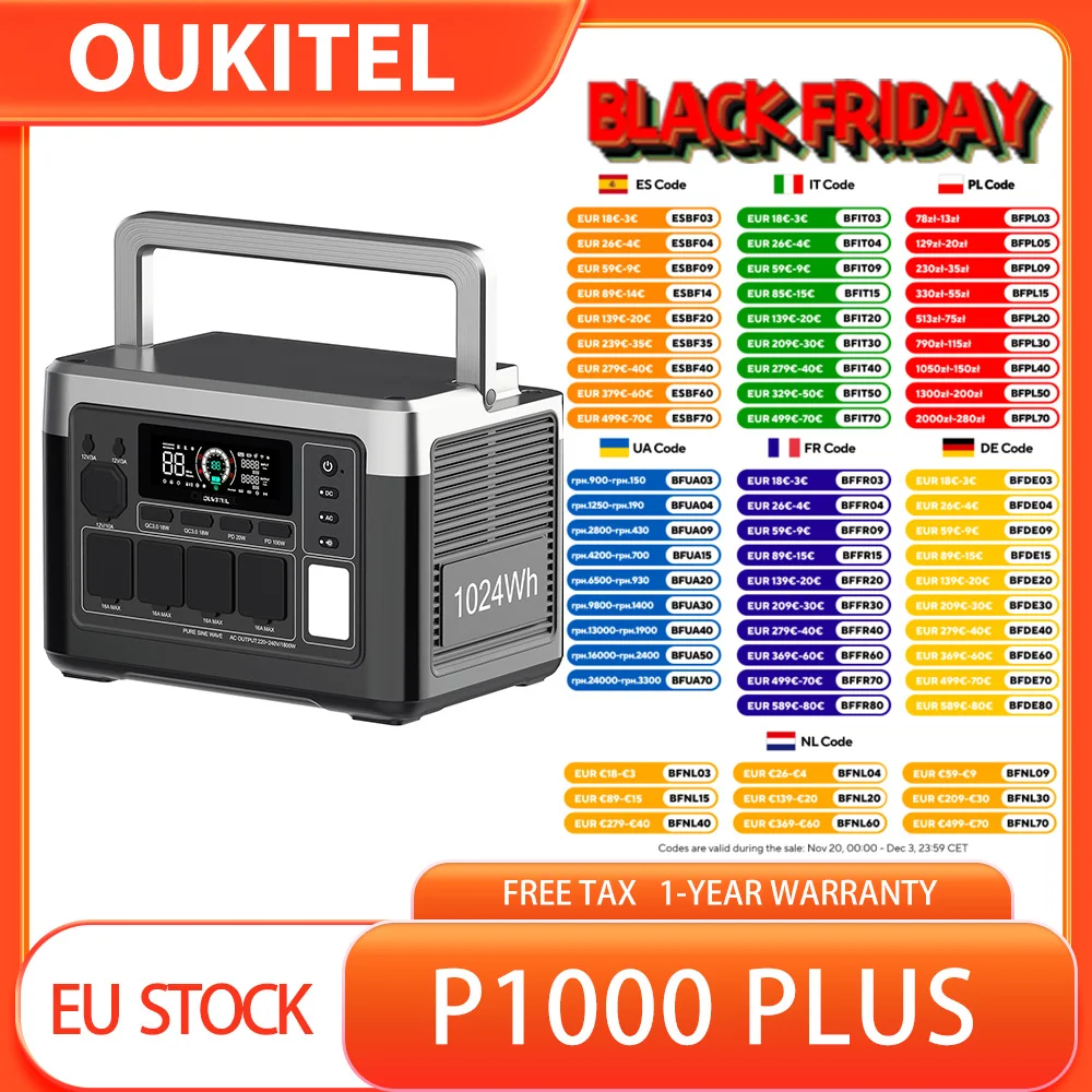 OUKITEL P1000 PLUS Tragbares Kraftwerk, 1800 W 1024 Wh Solargenerator mit LiFePO4-Akku, schnelles Aufladen, intelligente App-Steuerung