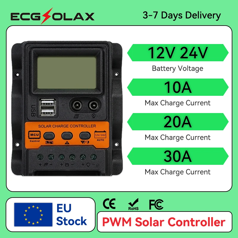ECGSOLAX Solarladeregler 12V 24V Laderegler für Solarpanel Blei-Säure-Batterie 10A 20A 30A Dual USB 5V 2,5A Ausgang