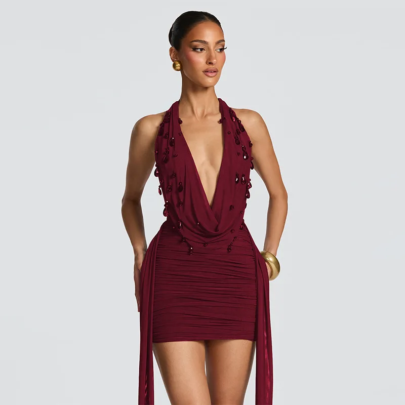Elegantes, gerafftes, figurbetontes kurzes Kleid für Damen, sexy, ärmellos mit Schleife, kurzes Minikleid, Sommer, Abendparty, Burgunderrot, Braun, Schwarz