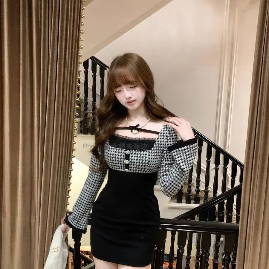 Japanisches Herbst- und Winterkleid mit Hahnentrittmuster, langärmlig, schmal geschnitten, schwarz, süßes Kleid, Neu 2026