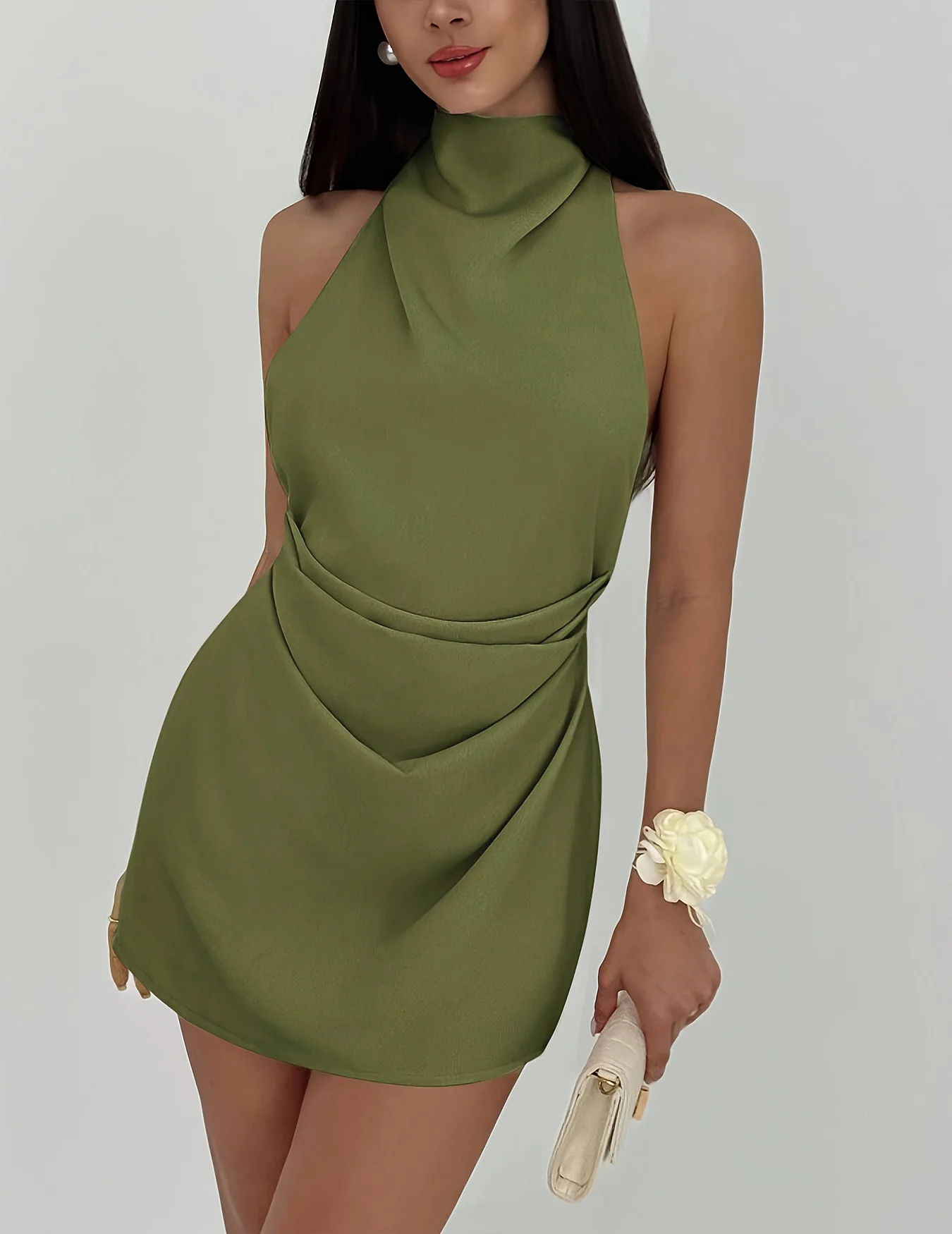 Damen Plissiertes Hochgeschlossenes Rückenfreies Minikleid mit Bindegürtel Satin-Minikleid für Abendparty und Cocktail
