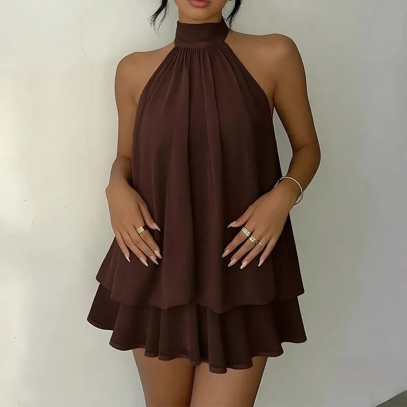 2026 Elegantes Damen-Minikleid mit Neckholder, ärmellos, Rüschen und Chiffon-Lagen – Lässiges Sommer-Partykleid für Strandurlaub im Y2K-Stil