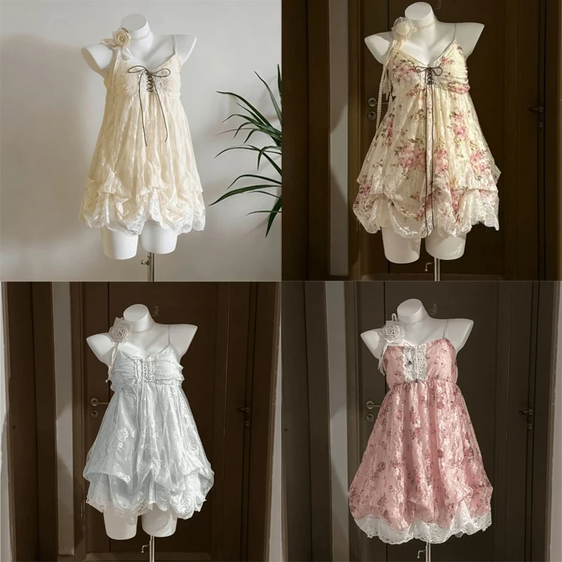 Französisches Vintage-Kleid mit Spitzen-Tüllbesatz, Rüschen, Spaghettiträgern, Schnürung vorne, Ballon-Saum, Mini-Kleid im süßen Feen-Stil für Damen