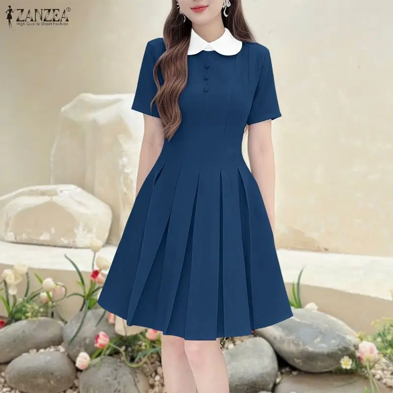 ZANZEA Sexy Mini-Kleider für Damen, Kurzarm, Revers, Kurze Kleider 2026, Modische Patchwork-Freizeitkleider, Lässige Plissierte Party-Sommerkleider