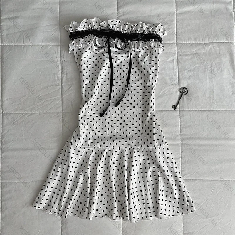 Sommerliches, süßes, niedliches, gepunktetes, trägerloses Kleid mit Schleife, europäisches und amerikanisches Highstreet-Kleid, sexy, vielseitiges, schmal geschnittenes Mini-Kleid