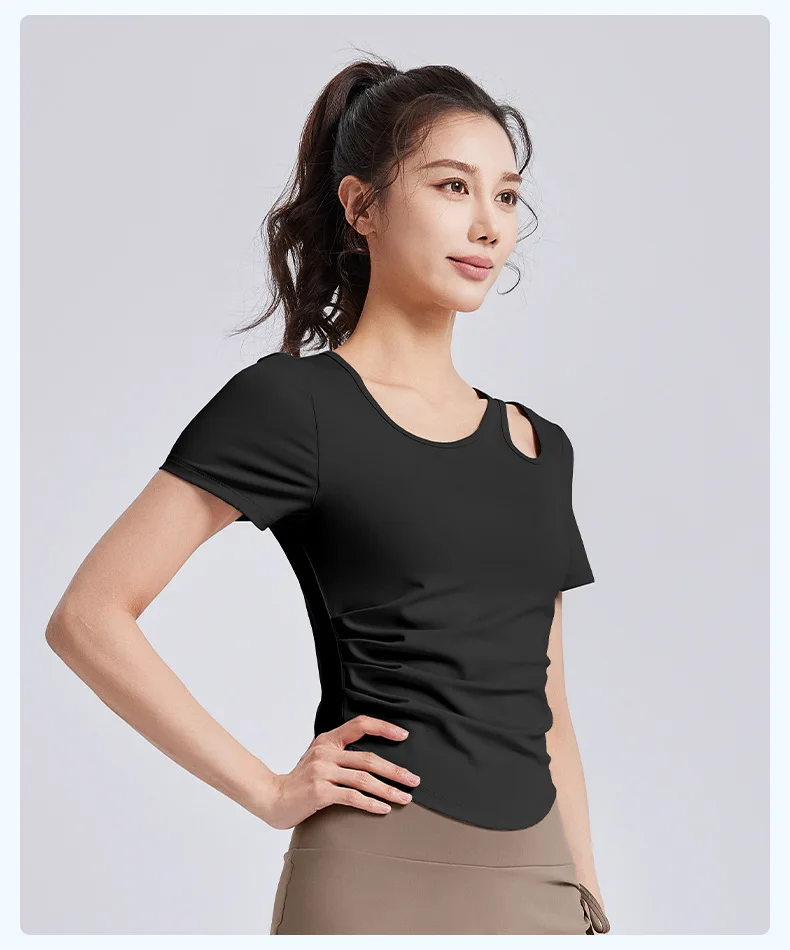 Kurzärmliges Yoga-Oberteil für Damen mit Cut-Outs und Raffdetails, gepolsterter BH, schlankmachendes Fitness-Top