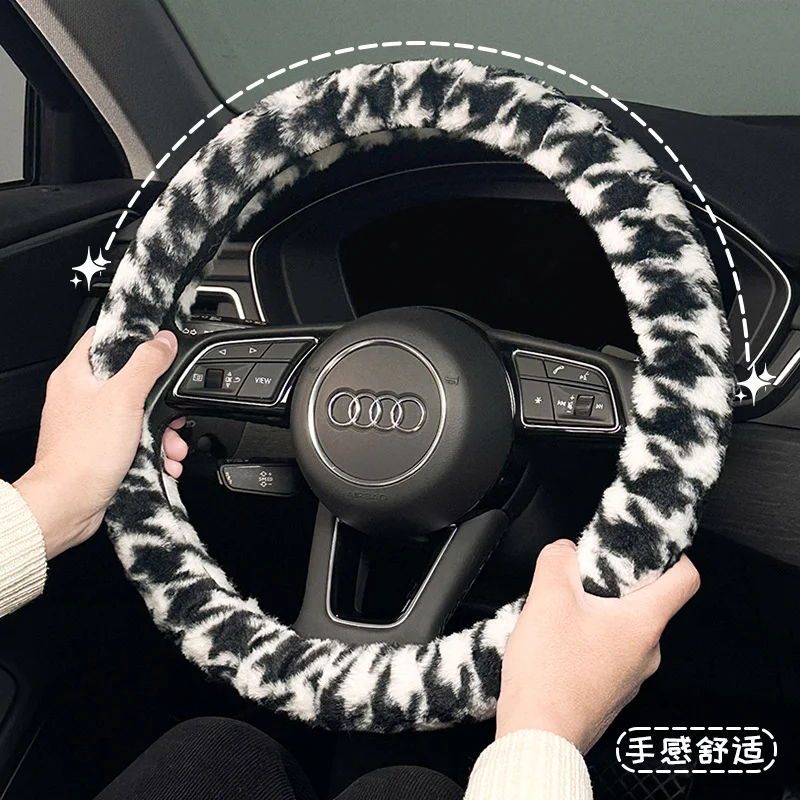 Einfacher Kfz-Lenkradbezug mit Hahnentrittmuster aus Kaninchenfell, gemütlich und warm für den Herbst- und Wintergebrauch