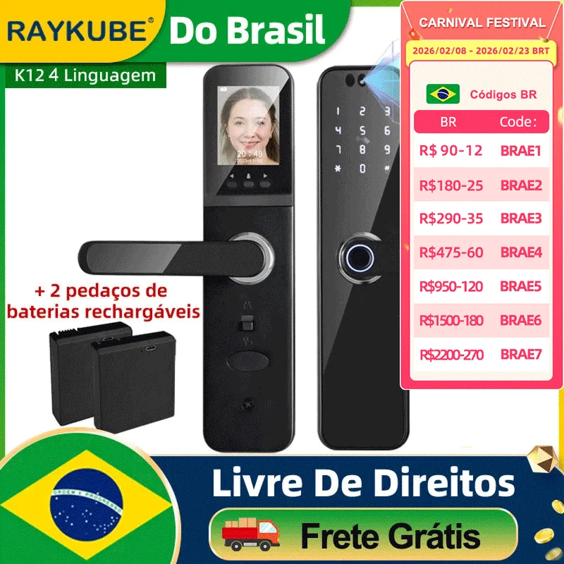 Do Brasil RAYKUBE K12 mit wiederaufladbaren Lithium-Batterien, Tuya WiFi-Kamera, elektronisches Schloss, 3D-Gesichts-Fingerabdruck, intelligentes Türschloss