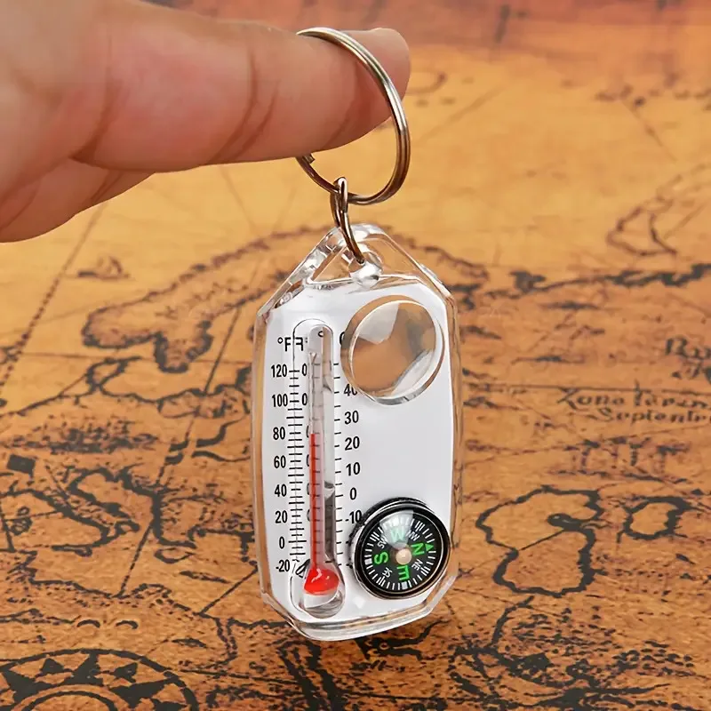 3-in-1-Schlüsselanhänger-Kompass, tragbarer Mini-Schlüsselanhänger, Outdoor-Thermometer, Lupe, Kompass, Camping-Essentials, Überlebenswerkzeuge,