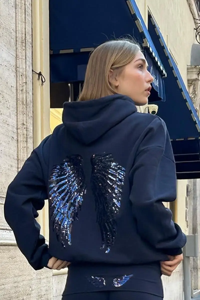 Frauen Y2k Trendy Elegante Casual Pullover Herbst Easy Match Pailletten Flügel Druck Hoodie Tops Dame Lose Pendler Büro Kleidung