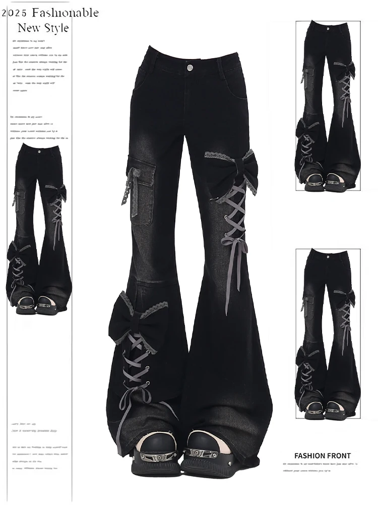 Damen Low Rise Flare Jeans Bow Lace Up Japanische Designer Denim Hosen Shoujo Y2k American Retro Bell Bottom Jeans Harajuku Neu