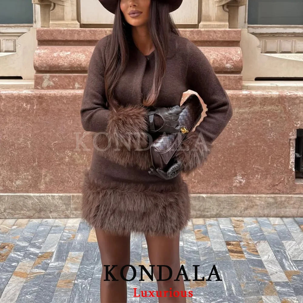 KONDALA Casual Chic Schokolade Braun Stricken Frauen Anzug Langarm O Neck Strickjacken Frauen Mantel Mini Kleid Mode 2025, Party Sets