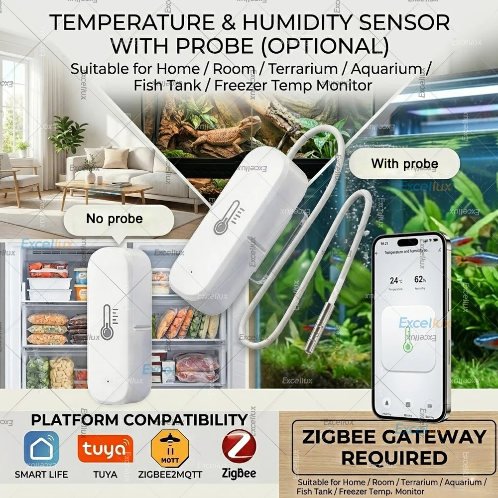Zigbee Smart Temperatur- und Feuchtigkeitssensor, optional mit 1M wasserdichter Thermometer-Sonde für Tuya Z2M Home Assistant, Aquarium, Gefrierschrank