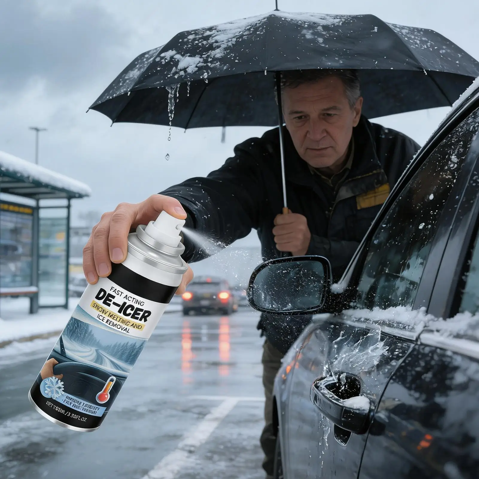 Eisschmelzspray, Schneeschmelzmittel, Abtaufflüssigkeit für die Autowartung vor Ausflüssen, Unterstützung des Straßenrandes, morgenslang