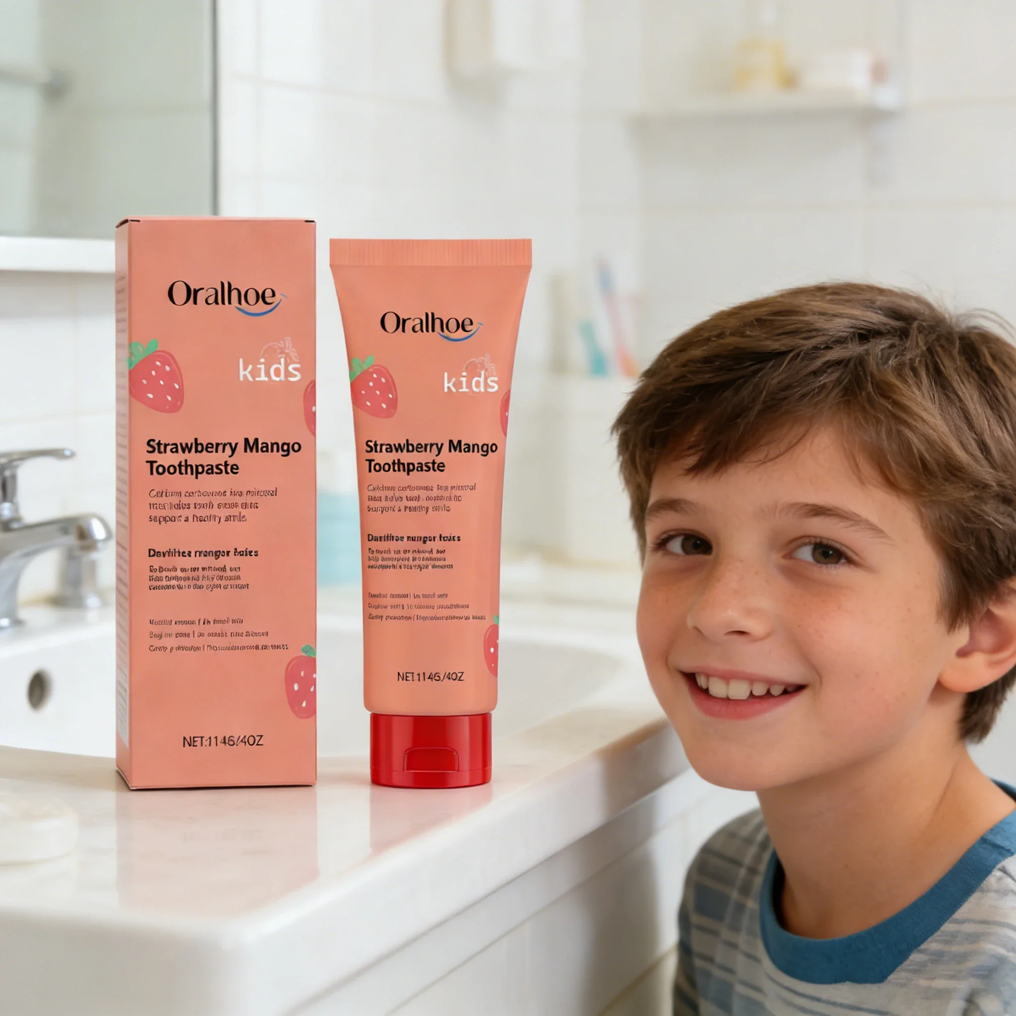 ORALHOE Kinderzahnpasta Erdbeergeschmack, Anti-Karies & Sanfte Reinigung, Frischer Atem für Kinder, Tägliche Mundpflege, Fruchtgeschmack