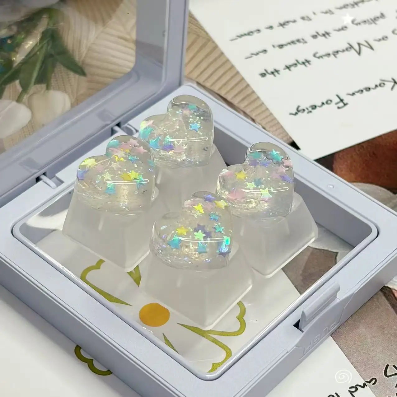 DIY personalisierte transparente herzförmige Tastenkappen, durchscheinende Glitzer-Stern-Richtungstasten, Gaming-Tastenkappen für mechanische Tastaturen