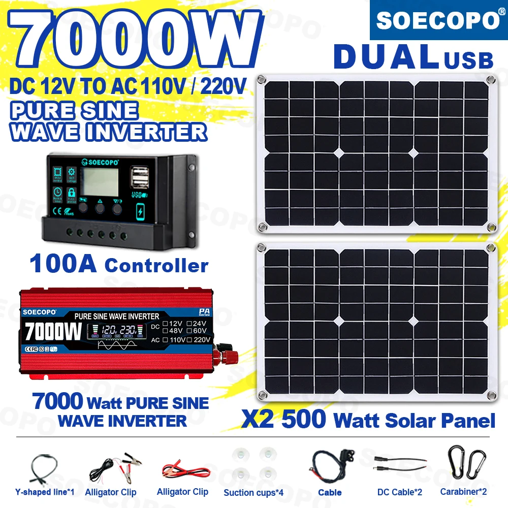 SOECOPO 7000 W Solarsystem-Kit, 12 V reiner Wellen-Wechselrichter, 2 x 500 W Photovoltaik-Panels und 100 A-Controller für Zuhause, netzunabhängiger Balkon