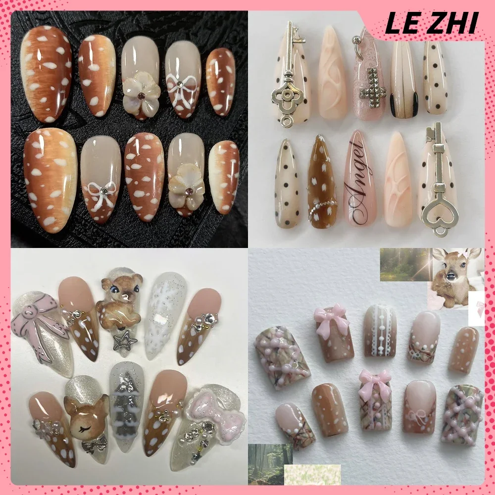 Wunderschöne Cartoon-Kaninchen-handgemachte lange Sarg-Stilettos zum Aufdrücken der Nägel, Schleife, Perle, Diamant, Schneeflocke, Apfel, vollständige Abdeckung der Nägel