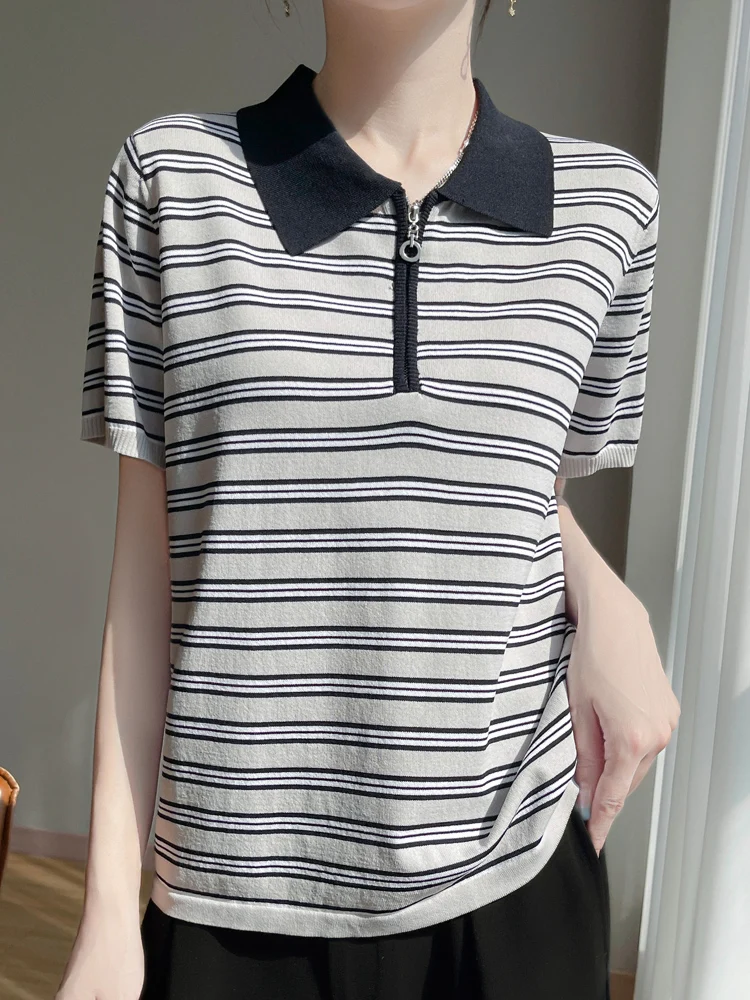 2023 neue Sommer Casual Gestreiften POLO Kragen Dünne T-shirt für frauen Sommer Halb Zipper Kragen Top