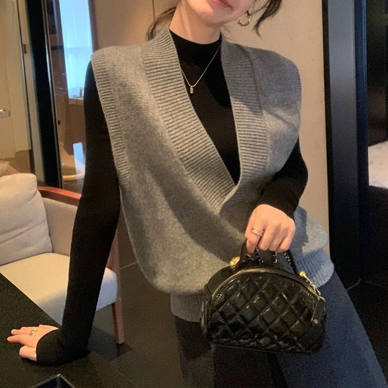 Frau V-ausschnitt Stricken Pullover Weste Ärmellose Tops Jumper Pullover Strickwaren Vintage Koreanische Weibliche Frühling Herbst Büro Dame Preppy